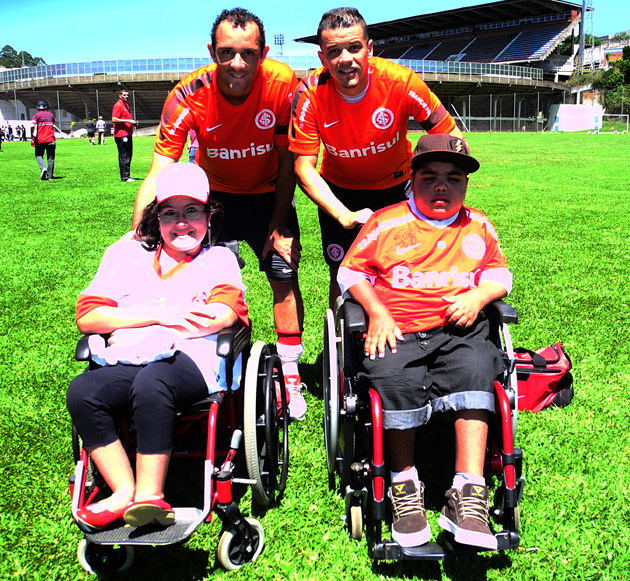 O presidente do Internacional Giovani Luigi (E, acima) presenteou com uma camisa oficial de jogo os jovens cadeirantes Elizabete da Rocha e Vinicius Santos Rodrigues, que prestigiaram o treino colorado da manhã deste sábado (23/02) no CT do Caxias. Os jogadores Josimar (E, abaixo) e D'Alessandro também fizeram um belo gesto de carinho ao parar para uma fotografia com a dupla de torcedores.