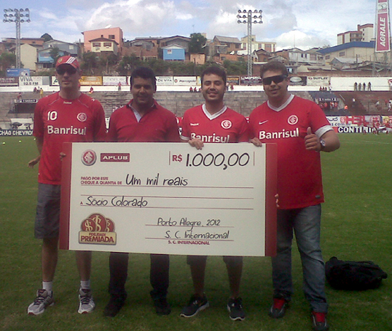 O sócios Gustavo Jacueq Ribeiro e Alisson da Silva Koglin receberam cheque simbólico de R$ 1 mil antes da partida contra o Esportivo, neste domingo (3/3), no Estádio Centenário. Eles foram contemplados na promoção Fidelidade Premiada, que a cada semana sorteia um associado em dia com a sua mensalidade, em uma parceria do Internacional com a Aplub.