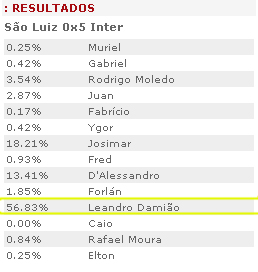 Grande destaque da final da Taça Piratini, o atacante Leandro Damião recebeu o reconhecimento da torcida colorada e foi eleito o melhor em campo contra o São Luiz. O camisa 9 do Inter, autor de dois gols e com participação direta em outros dois na vitória por 5 a 0, recebeu a maioria dos votos (56.83%) na enquete promovida pelo site. Confira os números