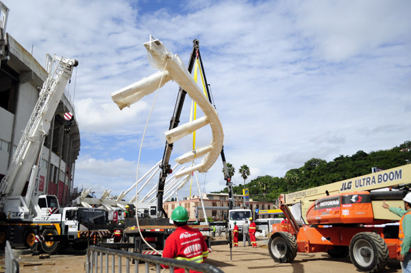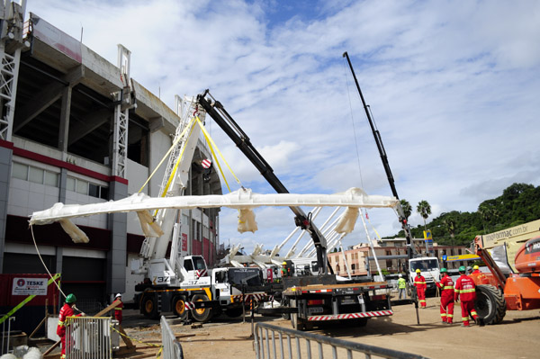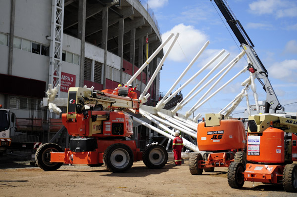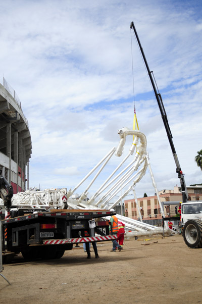 O Beira-Rio, sede gaúcha da Copa do Mundo de 2014, segue firme com sua obra de modernização que o elevará ao patamar de estar entre os mais modernos estádios do planeta. A nova cobertura, que dará todo o charme ao empreendimento, já está sendo montada no pátio do Estádio desde a última segunda-feira (18/03). Partes da primeira folha estão sendo montadas e devem ser instaladas nesta semana. Ao todo, são 65 folhas que formam a nova cobertura do Beira-Rio.