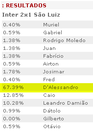 O meia D'Alessandro foi escolhido o melhor jogador em campo na vitória por 2 a 1 em cima do São Luiz, na noite desta quinta-feira (21/03). O craque colorado foi o autor do segundo gol do Inter e eleito com 67,39% dos votos em enquete promovida pelo site do Clube. Veja o resultado completo abaixo: