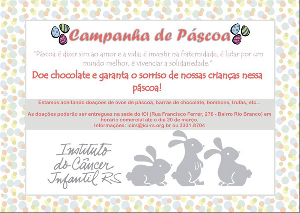 O Instituto do Câncer Infantil RS realiza até o dia 26/03 a Campanha de Páscoa. Ovos de Páscoa, barras de chocolates, trufas e bombons podem ser doados para os pacientes. O Internacional incentiva os colorados a participarem desta bela ação.