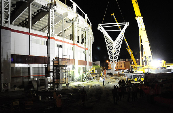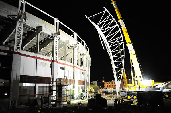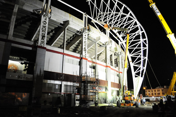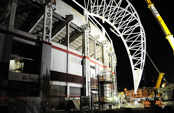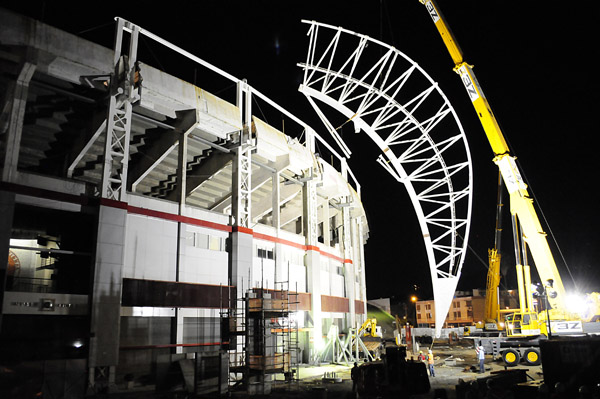 The major differential of the new and modern Beira-Rio stadium is now being outlined: this week, workers will work on assembling and hoisting the metal structure – produced in steel ¬– forming the Stadium’s roof. In the first stage, the structural bases, weighing a total 25 tons, will be assembled and erected with the aid of two cranes. Next, the two last parts will be hoisted, set to cover the grandstands. The metal structure of each of the 65 sheets will weigh 40 tons and measure 38 meters high by 53 meters wide. The metal structure will also support the large screens, which will exhibit details of the match, and the pitch lighting.