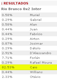 O jovem atacante Caio foi eleito o melhor jogador em campo na vitória colorada diante do Rio Branco-AC, pela Copa do Brasil. Autor do primeiro dos dois gols que classificaram o Inter para a segunda fase da competição, o atleta recebeu 82,53% dos votos em enquete promovida pelo site do Clube. Veja o resultado completo abaixo.