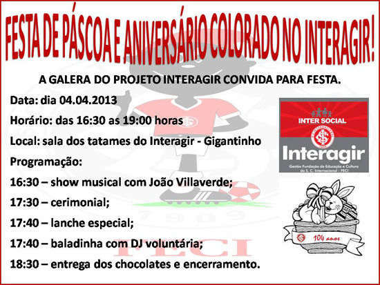 A galera do Projeto Interagir comemorou na última quinta-feira (4/4) o aniversário de 104 anos do Sport Club Internacional juntamente à Páscoa, em uma festa que teve muita diversão.