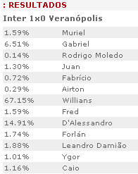 Autor do gol que garantiu a vitória sobre o Veranópolis e a vaga na final da Taça Farroupilha, o volante Willians foi eleito o melhor jogador em campo pelos internautas colorados. O camisa 8 recebeu 67.15% dos votos. Confira os números da enquete: