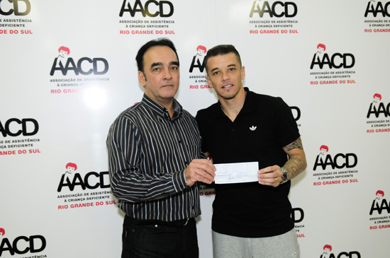 O meia D’Alessandro esteve na manhã desta quinta-feira (09/05) na Associação de Assistência à Criança Deficiente Porto Alegre (AACD), onde realizou uma doação para a instituição. O gerente administrativo da AACD, Cleo Jaques, foi quem recebeu o cheque das mãos do atleta colorado. A transação se refere à Transação Disciplinar Desportiva realizada pelo jogador e a Procuradoria do STJD, em virtude de sua suspensão por dois jogos devido à exrpulsão diante do Rio Branco, em duelo válido pela 1º fase da Copa do Brasil.