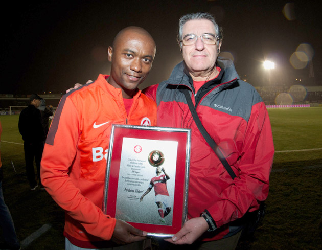 "Esta homenagem é pela tua contribução e lealdade ao Inter", disse o diretor de futebol Luís César Souto de Moura ao entregar uma placa em homenagem a Kleber.