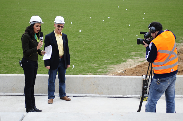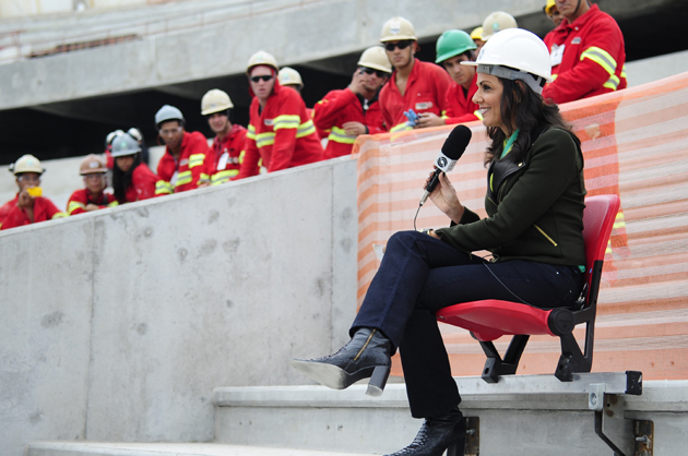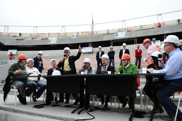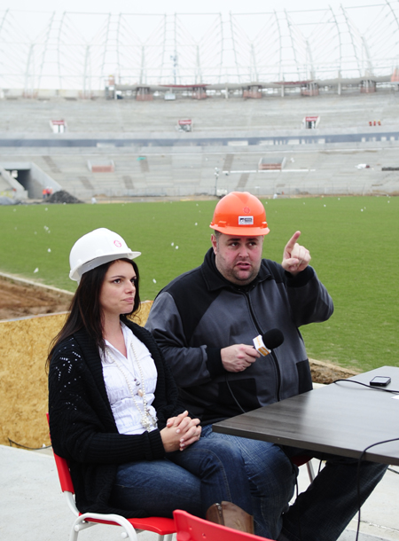 O cenário dos tradicionais programas Jornal do Almoço, da RBS TV, e Sala de Redação, da Rádio Gaúcha, fugiram do convencional nesta quarta-feira (12/06). As transmissões ocorreram dentro do Beira-Rio, em meio às obras já avançadas do Estádio – 71% já concluídas. Acomodado nas ampliadas arquibancadas inferiores, o time de jornalistas evidenciou a evolução do Gigante, ou “o templo do futebol gaúcho”, como se referiu Kenny Braga.