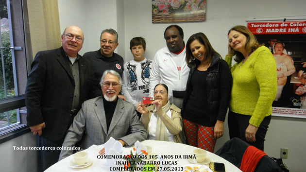 O secretário geral Gelson Pires, o diretor de marketing Jorge Avancini e o ex-jogador Caçapava compareceram no último domingo (16/6) na celebração do aniversário de 105 anos da Irmã Inah, a colorada mais antiga que se tem conhecimento. A celebração ocorreu na Congregação das Irmãs Terezianas, em Porto Alegre. A colorada que tem mais idade do que o próprio Inter recebeu muito carinho de todos.