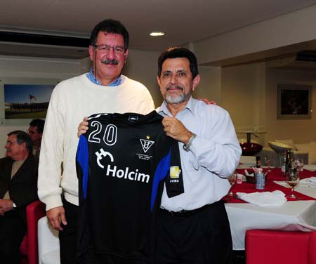 Luis Antônio Lopes (D) exibe a camisa da LDU presenteada por Patrício Torres