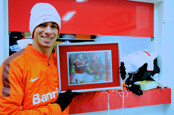 Antes do treino desta terça-feira (23/7), dentro do vestiário, o jogador recebeu das mãos do capitão D’Alessandro uma placa do Clube em homenagem a importante marca alcançada pelo centroavante.