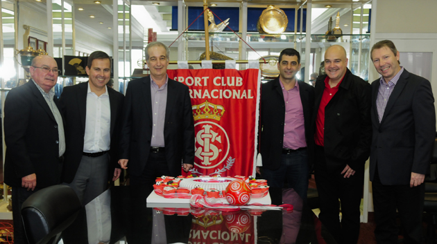Da esq. para dir.: Gelson Pires (secretário geral do Inter), Eduardo Smith (vice-presidente do Grupo RBS), Giovanni Luigi (presidente do Inter), Marcelo Flores (presidente da Brio), Edson Erdmann (sócio-diretor da Histórias Incríveis) e Flavio Steiner no encontro que marcou o anúncio da empresa que fará festa oficial de abertura do Novo Beira-Rio