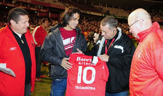 Ator André Arteche (E, com a camiseta) recebe camiseta personalizada das mãos do vice-presidente de marketing Jorge Avancini, ao lado dos vice-presidentes do Inter Gelson Pires (D) e Mário Sérgio Martins, no gramado do Beira-Rio antes de Inter 3x0 Coritiba. O ator gaúcho e colorado interpreta o popular personagem Indra da novela Caminho das Índias, na Rede Globo