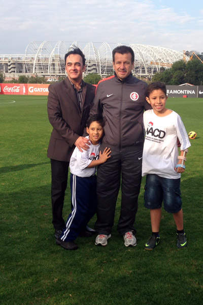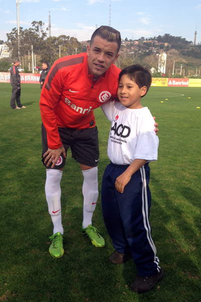 Antes do treino da última quinta-feira (8/8), os jogadores do Inter receberam uma visita especial. Getúlio Felipe Fernandes da Silva, 9 anos, e Cauã Dorneles dos Santos, 10, representaram as 770 crianças com deficiência física que são tratadas na AACD (Associação de Assistência à Criança com Deficiência). Os meninos aproveitaram a oportunidade para pedir autógrafos e tirar fotos com os atletas.