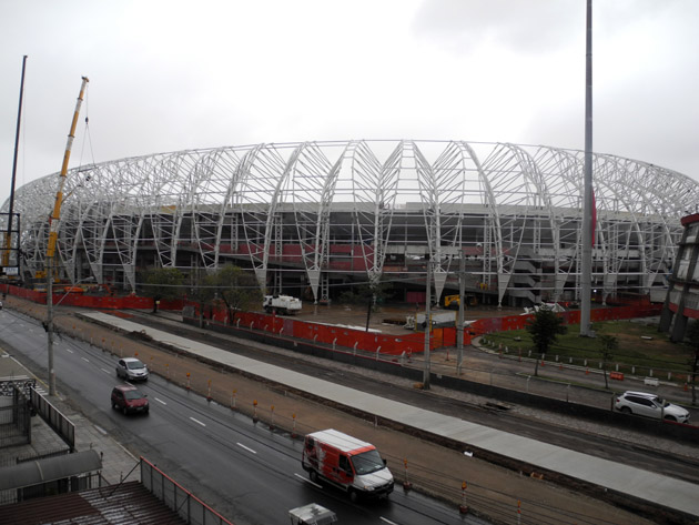 O Beira-Rio está emergindo sobre a Avenida Padre Cacique. Para quem passa pela via, é impossível não notar a evolução das obras do Gigante, que, a cada dia que passa, vai tomando rapidamente a forma pretendida. Até o momento, o Estádio já atingiu 76,5% do processo de reformulação. Com a instalação de 44 P1 e P2, 11 P3 e cinco P4, os módulos da cobertura já preencheram a fachada da frente do Beira-Rio.