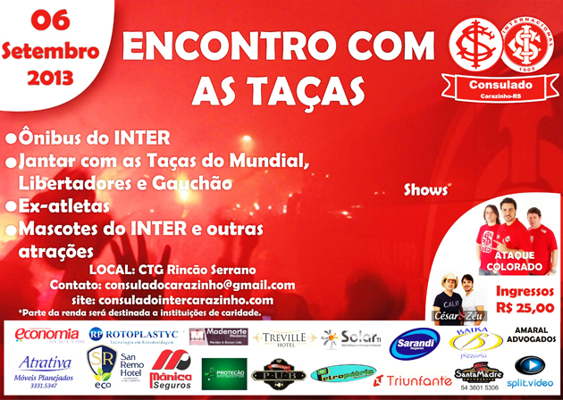 O torcedor colorado que reside em Carazinho tem um evento imperdível no dia 6 de setembro. O consulado local está organizando o “Encontro com as Taças”, um jantar que reunirá ex-jogadores, taças, ônibus do Inter e diversas outras atrações no CTG Rincão Serrano. O ingresso custa R$25 e pode ser adquirido antecipadamente neste sábado (31/08), em quiosque do consulado na Praça Central de Carazinho. O torcedor também pode comprar na Doctor Pub, loja Triunfante, Atrativa Móveis Planejados, CTG Rincão Sereno e com a diretoria do consulado. Para obter outras informações, clique aqui e acesse o site do núcleo colorado de Carazinho.