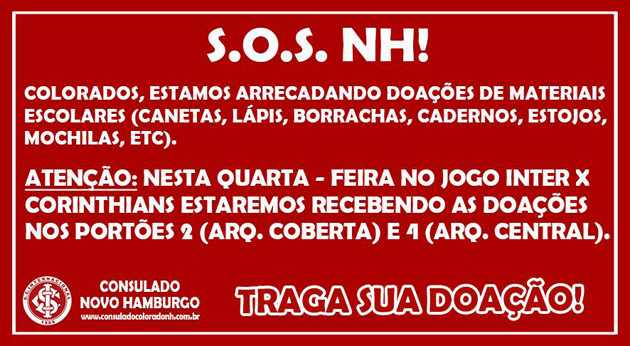 O consulado de Novo Hamburgo convoca a torcida colorada para doar material escolar na próxima quarta-feira (4/9), antes do jogo de Inter x Corinthians, pela 18ª rodada do Brasileirão. Os postos de coleta estarão nos portões 02 - Arquibancada Coberta e 04 - Arquibancada Central.