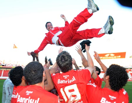 Bicampeão: jogadores arremessam o técnico Osmar Loss para o alto