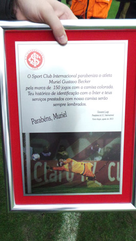 Na partida frente ao Bahia, na última quinta-feira (19/09), Muriel alcançou uma marca emblemática pelo Inter. Prata da casa, o goleiro é mais um jogador a completar 150 jogos pelo Campeão de Tudo. Como reconhecimento, na rodada do final de semana, Muriel recebeu pelas mãos do diretor de futebol Luis César Souto de Moura uma placa alusiva aos serviços prestados ao Clube. Uma justa homenagem ao dedicado gaúcho de Novo Hamburgo.