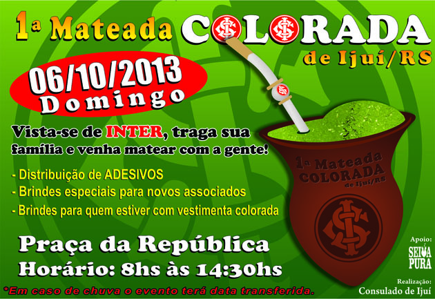 O Consulado de Ijuí convida todos os colorados da cidade e região próxima para participarem da 1º Mateada Colorada na Praça da República. Haverá fornecimento de erva-mate no local. Venha com sua família, vista-se de colorado e mostre seu amor pelo Inter!
