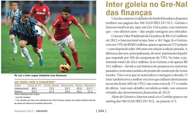 Em sua tradicional edição '500 Maiores do Sul' – compêndio que reúne as 500 principais empresas do Rio Grande do Sul, Santa Catarina e Paraná – a Revista Amanhã coloca o Sport Club Internacional como o maior clube de futebol do Sul do País. O Campeão de Tudo ocupa a 161ª colocação geral do ranking divulgado no último mês de setembro, seis posições acima em relação à lista publicada em 2012.