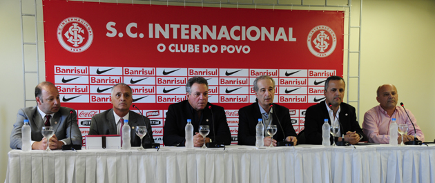 Na foto, da esq. para dir: Eduardo Lacher (assessor de futebol), Marcelo Medeiros (vice-presidente de futebol), Abel Braga, presidente Giovanni Luigi, Roberto Melo (assessor de futebol) e Newton Drummond (diretor executivo de futebol)