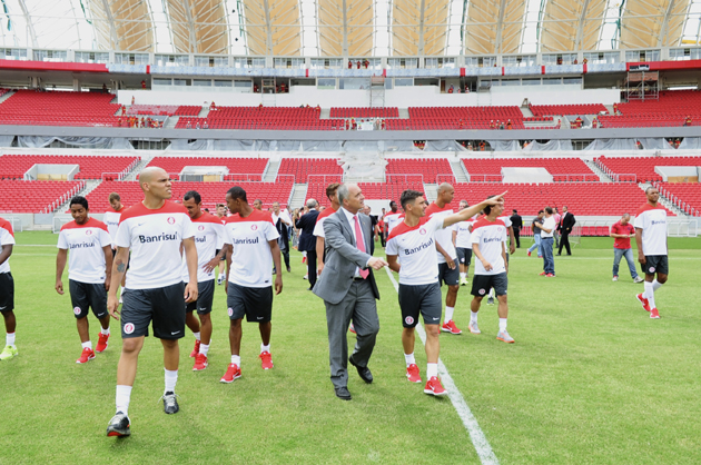 Jogadores contemplam o novo Beira-Rio no dia da reapresentação para a temporada 2014