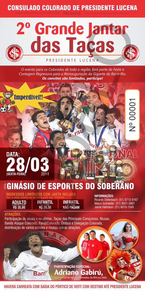 O consulado de Presidente Lucena vai realizar a 2ª edição do Jantar das Taças, reunindo torcedores e ex-atletas do Clube, no dia 28 de março, uma semana antes da reinauguração do Beira-Rio. “Não é uma data qualquer, pois estaremos em contagem regressiva para a Festa de Reinauguração do Estádio da Copa do Mundo FIFA do Brasil aqui no Rio Grande do Sul”, enfatizou o cônsul Ricardo Elias Diefenbach.