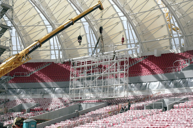 Estruturas metálicas dos telões são colocadas no Gigante