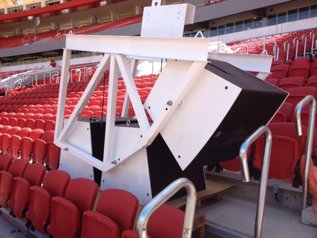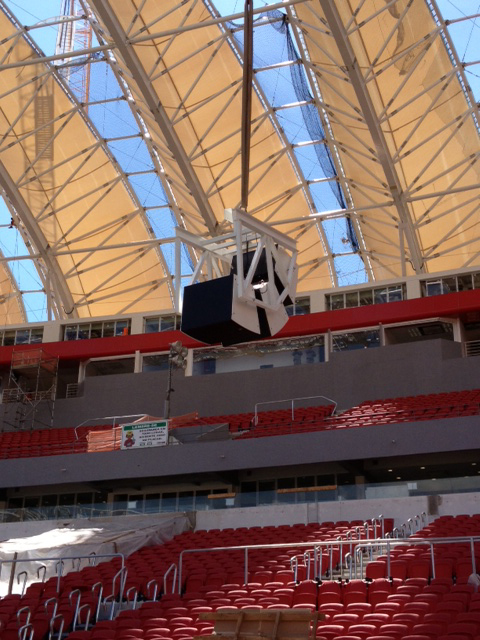 Na tarde desta segunda-feira (20/01) foram realizados testes para erguer os primeiros alto-falantes do novo Beira-Rio. Cada estrutura é composta por três caixas de som e ficará fixada na cobertura do Estádio.