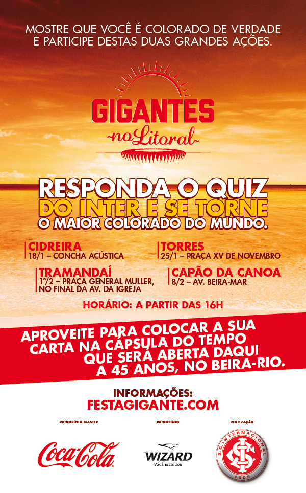 As comemorações para a abertura do novo Beira-Rio seguem com uma grande festa no verão nas principais praias gaúchas – Cidreira, Torres, Tramandaí e Capão da Canoa. Em janeiro e fevereiro, o Gigantes no Litoral – terceiro evento que celebra o novo palco de vitórias do Sport Club Internacional – buscará o Maior Colorado do Mundo. Por meio de um jogo interativo, perguntas e respostas sobre a história do time vão testar e eleger os melhores torcedores.