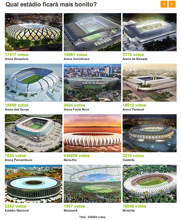 O Beira-Rio é o estádio mais bonito da Copa de 2014 na opinião de internautas do Portal Terra. Em enquete promovida pelo site, o estádio colorado já recebeu mais de 436 mil votos, 25 vezes mais do que o segundo colocado, a Arena Amazônia, eleita por cerca de 17 mil internautas. A eleição continua. Clique aqui para votar!