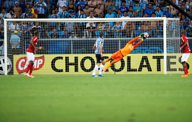 Mas o Grêmio era perigoso nas suas investidas e esteve perto de abrir o placar. Aos 11min, Zé Roberto cobrou falta e por pouco de Barcos não conseguiu o arremate no interior da pequena área. Aos 14min, o atacante argentino ficou cara a cara com Muriel e chutou rasteiro, em cima do goleiro colorado. Aos 33min, Edinho, ex-Inter, soltou uma pancada da intermediária e Muriel fez defesa espetacular, espalmando a bola para escanteio.
