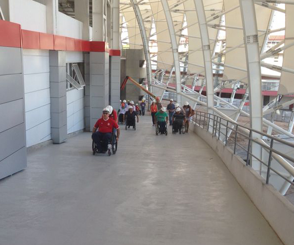 O Internacional apresentou na tarde desta segunda-feira a um grupo de portadores de necessidades especiais (PNEs) a acessibilidade oferecida pelo novo Beira-Rio. O grupo subiu até o nível 5 do Estádio, onde ficará a área para PNEs, e testou a rampa de acesso em caso de evacuação de emergência.