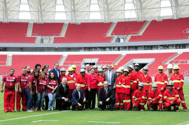 Dilma cumprimentou operários, os funcionários do Clube e os jogadores do Internacional. No centro do gramado, ao lado do capitão colorado D’Alessandro, a presidenta deu o ponta pé inicial simbólico do remodelado Beira-Rio. “Gente, está lindo!”, exclamou Dilma ao conhecer o Gigante.