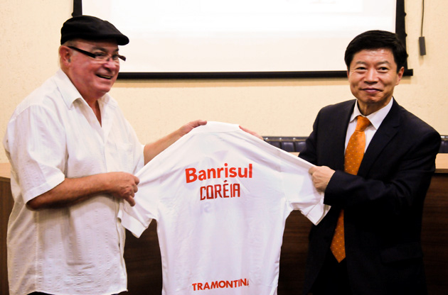 Secretário geral do Inter Gelson Pires (E) entrega camiseta colorada personalizada ao cônsul-geral Young Jong Hong (D)