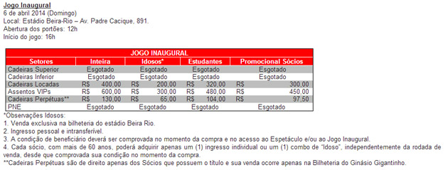 A compra de ingressos para o espetáculo Os Protagonistas e Jogo Inaugural também pode ser realizada pelo site www.festagigante.com ou www.livepass.com.br/festa-gigante, Call Center e na Bilheteria do Beira-Rio.