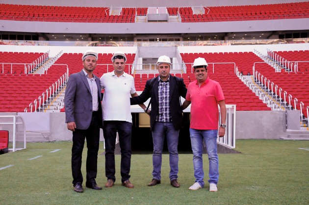 Da esq. para dir.: auxiliar técnico da base da Seleção, Mauricio Copertino, supervisor de logística do Inter, Adriano Loss, coordenador da base da Seleção, Alexandre Gallo, e gerente executivo do Inter, Jorge Macedo.