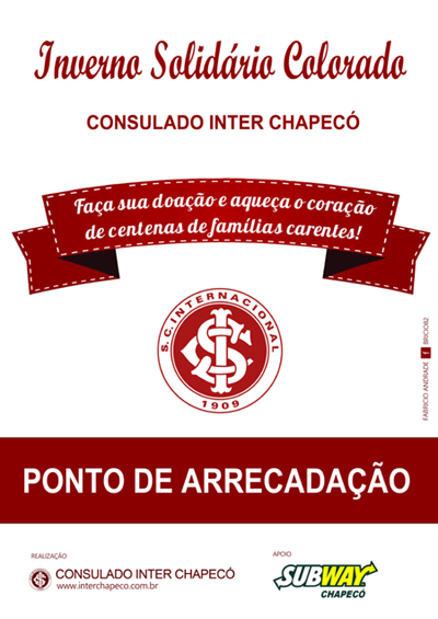 O consulado do Inter em Chapecó-SC lança a tradicional campanha de arrecadação de agasalhos INVERNO SOLIDÁRIO COLORADO! Aproveite essa oportunidade para ajudar quem precisa. Faça sua doação nos seguintes PONTOS DE ARRECADAÇÃO: