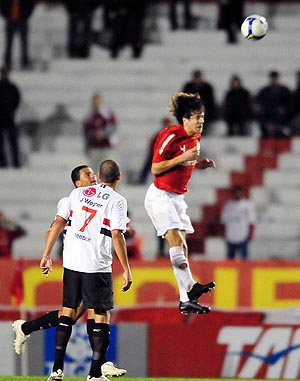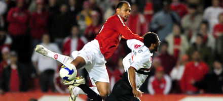 O Inter pressionava em busca do terceiro. Aos 40min, Nilmar tocou em Guiñazu, que achou Alecsandro na área. O centroavante chutou de bico para defesa de Dênis. Quase o terceiro. Um minuto depois, nova jogada aérea do Inter. Agora foi Andrezinho que cobrou falta para Sorondo (foto ao lado) cabecear para a pequena área e a zaga afastar no desespero. O time colorado dominava inteiramente a partida, trocava passes, avançava, enquanto o São Paulo só ficava na marcação.