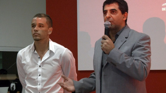 D'Alessandro e o presidente da Brio, Marcelo Flores na apresentação do Premier Club