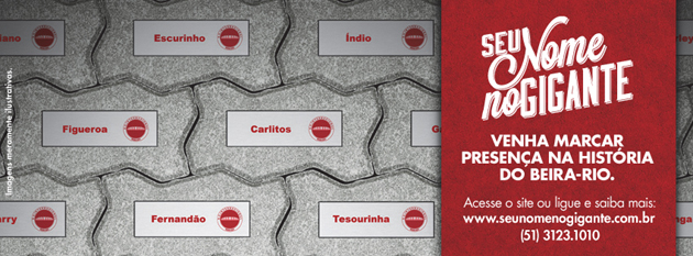 Os associados ou não do tetracampeão gaúcho poderão adquirir tijolos personalizados, que serão instalados no entorno do reformulado Beira-Rio. A iniciativa faz parte do projeto “Seu Nome no Gigante”, uma edição repaginada da campanha que marcou a construção do estádio José Pinheiro Borda, nos anos 60, pela qual o clube pedia a seus torcedores que doassem cimento e tijolos para as obras.