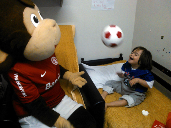 Jorge Henrique e mascote Escurinho visitam menino em hospital