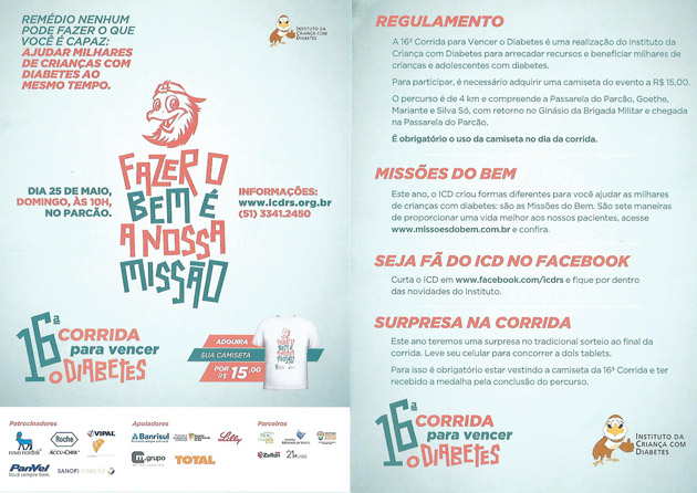 Os consulados da grande Porto Alegre estão apoiando a Fundação de Educação e Cultura do Sport Club Internacional (FECI) na campanha anual promovida pelo Instituto da Criança Com Diabetes. A 16ª Corrida Para Vencer o Diabetes arrecada fundos vendendo camisetas alusivas ao evento, que será realizado no dia 25 de maio, às 10h, no Parque Moinhos de Vento (Parcão). E os consulados Colorados já estão mobilizados para ajudar: os torcedores podem adquirir a camiseta aos sábados no Parcão, Redenção e nos bairros dos consulados. Nos dias de jogos, também é possível comprar na frente do Gigantinho. Participe e colabore!