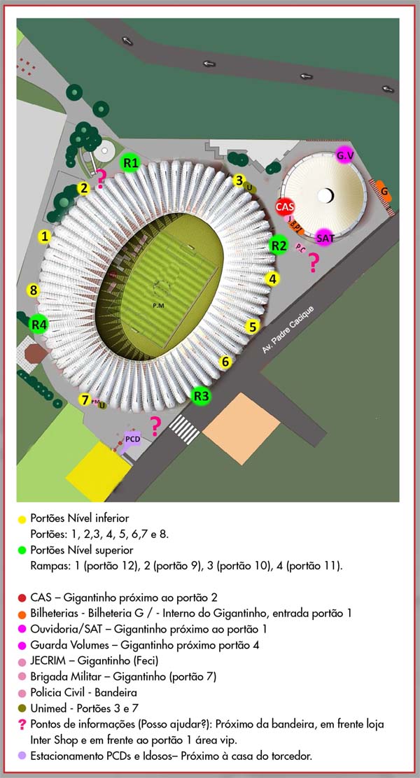 PCD’s e Idosos acessam pelo portão ao lado da Casa do Torcedor (antigo acesso de veículos da Av. Padre Cacique, entre o Museu e a Loja do Inter).