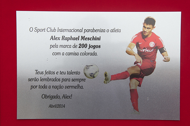 O meio-campista Alex, atleta campeão da Libertadores e do Mundo em 2006 pelo clube, alcançou a marca de 200 jogos pelo clube diante do Grêmio, no 2º Gre-Nal que decidiu o Campeonato Gaúcho deste ano. Antes do jogo com o Sport, neste domingo (04/05), Alex recebeu uma placa em referência à marca. O 1º vice-presidente eleito e também vice de futebol, Marcelo Medeiros, entregou a peça em referência aos serviços prestados pelo atleta à instituição colorada.