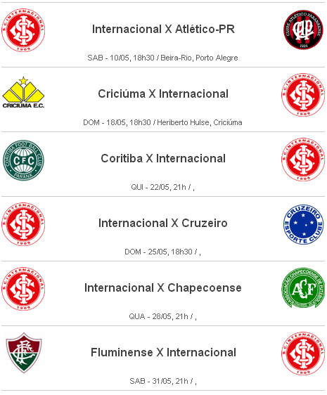 Antes da interrupção do Campeonato Brasileiro para a realização da Copa do Mundo, o Inter ainda disputará seis jogos. Confira: