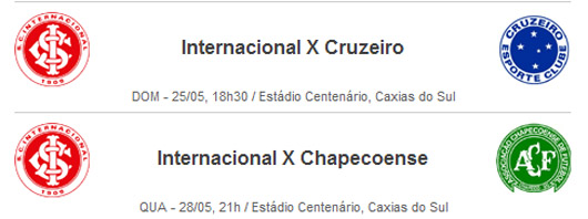 Os jogos do Internacional contra o Cruzeiro (25/5) e a Chapecoense (28/5), válidos pelo Campeonato Brasileiro, serão realizados no Estádio Centenário, em Caxias. Neste período, o estádio Beira-Rio está sendo administrado pela FIFA para a realização da Copa do Mundo.