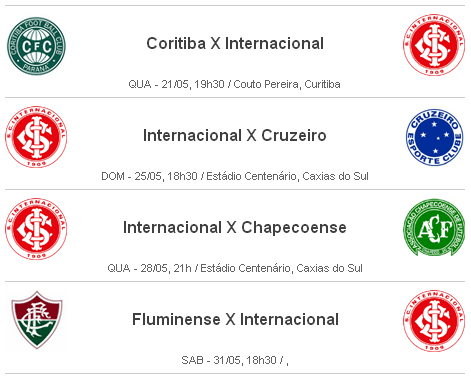 O primeiro desafio desta série será nesta quarta-feira (21/5), diante do Coritiba, no Couto Pereira. No próximo domingo (25/5), o Inter recebe o Cruzeiro, adversário direto na tabela, no Centenário, em Caxias do Sul. Uma semana depois, o Colorado volta a atuar na Serra contra a Chapecoense. No dia 31 de maio, vai ao Rio enfrentar o Fluminense.